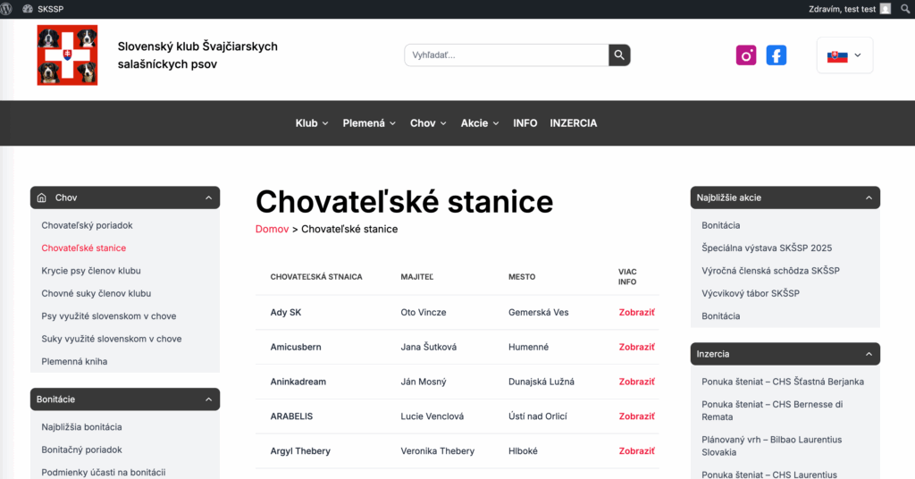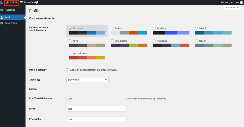 Po prihlásení budete presmerovaní na stránku Vášho profilu. Pre zobrazenie obsahu stránky a je potrebné kliknúť v ľavom hornom rohu na „SKSSP“ – na obrázku zvýraznené červenou.